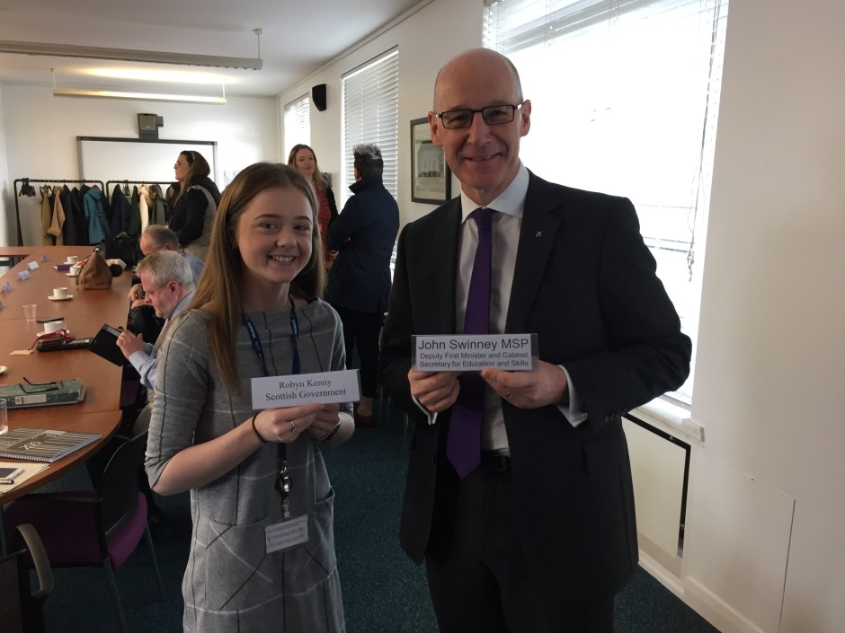 Former pupil Robyn Kenny now works with the Scottish Government as a Modern Apprentice and was at today’s meeting taking minutes. Great photo and well done Robyn.