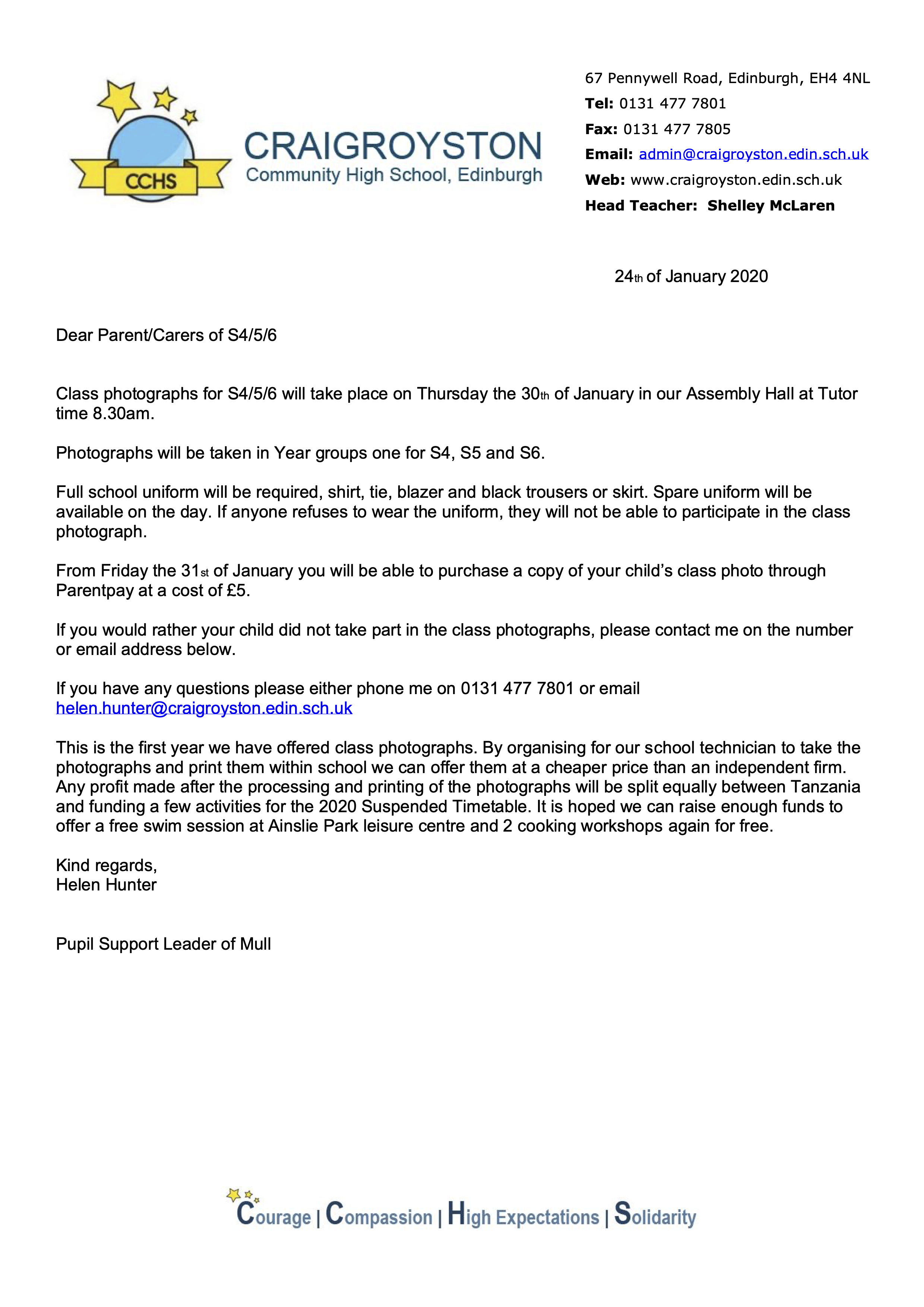 Say cheese!Class photos for S4/5/6 will be taken next week. Details in the letter below: